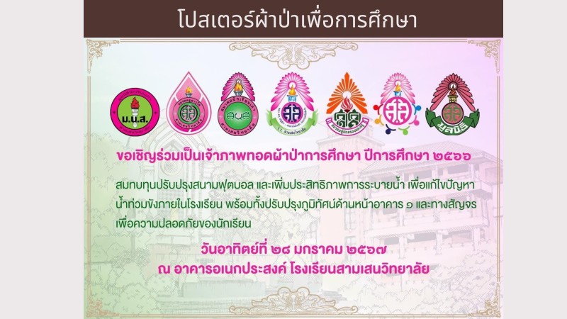 ขอเชิญร่วมเป็นเจ้าภาพทอดผ้าป่าเพื่อการศึกษา สมทบทุนปรับปรุงสนามฟุตบอล และเพิ่มประสิทธิภาพการระบายน้ำ เพื่อแก้ไขปัญหาน้ำท่วมขัง พร้อมทั้งปรับปรุงภูมิทัศน์ด้านหน้าอาคาร 1 และทางสัญจร เพื่อความปลอดภัยของนักเรียน